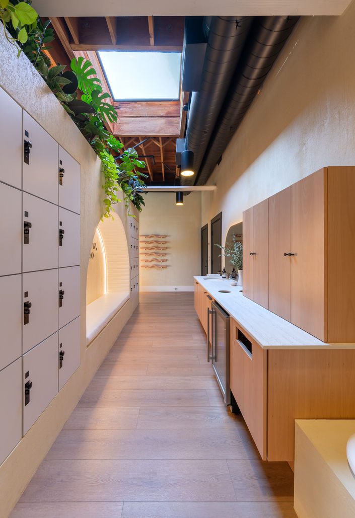 This kitchen project was designed for a small women’s Jiu-Jitsu studio, featuring beech veneer plywood with matching edge banding for a seamless look. The quartz countertop incorporates a built-in sink, along with integrated trash and recycling openings for convenience. The full-overlay cabinets were thoughtfully designed to include pull-out trash and recycling bins, an under-counter refrigerator, and a dedicated towel depository. Finished with an eco-friendly coating, this space balances durability and sustainability. A custom-made mirror with back-edge lighting adds a soft, natural glow, enhancing both functionality and ambiance.